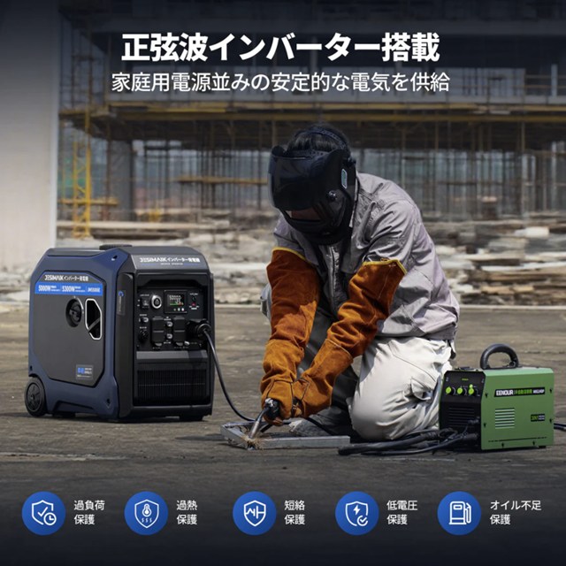 過負荷・過熱・短絡・低電圧・オイル不足の多重保護により、現場や防災用途でも安全に連続運転できます。
